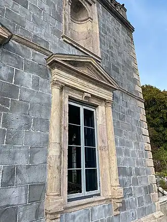 The main house was constructed in limestone ashlar with sandstone dressing ornamentation and architrave surrounds and pediments as well as fluted pilasters, plinth course, string course, quoins and parapet with balustrade. The window surrounds also contain carved mascarons while the main door frame includes a carved crest of the Lloyd family.[4]