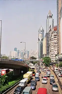 Gloucester Road in Wan Chai in August 2004, near the Wan Chai Sports Ground. East-bound traffic is to the left hand side of the flyover.