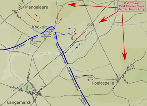 On 21 October, during the Battle of Langemarck, the opening engagement of the First Battle of Ypres, 1st Battalion occupied a salient around the village of Langemarck, nearly 5 miles (8.0 km) north of Ypres. Elements of C Company commanded by Lieutenant Wetherall, defending the tip of the salient at the hamlet of Koekuit, were particularly hard pressed, beating back repeated attacks until ordered to withdraw after dark. For his stubborn defence Wetherall was awarded the MC.[40][41][42]