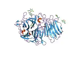 In molecular biology, glycoside hydrolase family 32 is a family of glycoside hydrolases EC 3.2.1., which are a widespread group of enzymes that hydrolyse the glycosidic bond between two or more carbohydrates, or between a carbohydrate and a non-carbohydrate moiety. A classification system for glycoside hydrolases, based on sequence similarity, has led to the definition of >100 different families.[1][2][3] This classification is available on the CAZy web site,[4][5] and also discussed at CAZypedia, an online encyclopedia of carbohydrate active enzymes.[6][7]