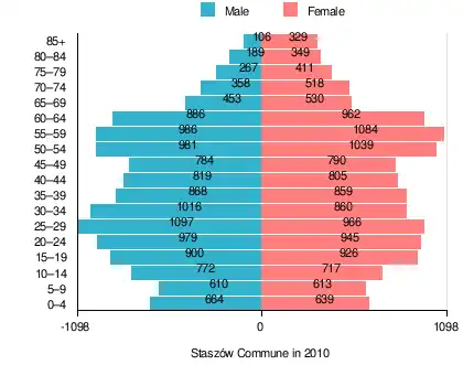 According to the 2011 Poland census, there were 26,077 people residing in Staszów Commune, of whom 48.8% were male and 51.2% were female (out of which the population in rural areas amounts to 10,969, of whom 49.6% were male and 50.4% were female). In the commune, the population was spread out, with 19.4% under the age of 18, 38.3% from 18 to 44, 25.1% from 45 to 64, and 17.1% who were 65 years of age or older (out of which the population in rural areas amounts to 20% under the age of 18, 38.5% from 18 to 44, 22.8% from 45 to 64, and 18.6% who were 65 years of age or older).[1]