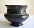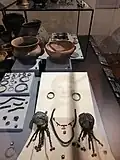The Golasecca culture is best known for its burial customs, where an apparent ancestor cult imposed respect for the necropolis, a sacred area untouched by agrarian use or deforestation. The early-period burials took place in selected raised positions oriented with respect to the sun. Burial practices were direct inhumation or in lidded cistae. Stone circles and alignments are found.[11] Burial urns were painted with designs, with accessory ceramics, such as cups on tall bases. Bronze objects are usually of wearing apparel: pins and fibulas, armbands, rings, earrings, pendants and necklaces. Bronze vessels are rare. The practice of cremation persists into the second period (early sixth to mid-fourth centuries).