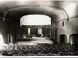 Theatrical activities in the town had become so popular that Kuster built a theater in 1924, the Theatre of the Golden Bough, to compete with the Arts and Crafts Club's theater. Kuster's new theatre opened on June 6, 1924. It borrowed the name "Golden Bough" from Roman mythology, where the Golden Bough refers to a branch with golden leaves, allowing the Trojan hero Aeneas to journey safely through the underworld.[10] The interior of the theater had 360 seats with wicker arm chairs. The stage had a depth of thirty feet with spot and flood lights, and a cyclorama at the back of the stage gave the effect of vast spaces. The orchestra space was large enough to seat thirty to forty musicians.[11][12] The theater hosted 50 productions each year and also educational programs.[13]