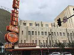 The hotel's casino operated until 1909, when gambling was banned in Nevada. The casino's blackjack and poker tables were subsequently put into storage.[4] By March 1918, Miller was considering a large addition to the hotel that would consist of reinforced concrete and would include 40 feet of frontage along Fremont Street.[15] The hotel gained additional popularity beginning in 1925, when city officials had Fremont Street paved. In 1931, the property was expanded to three and four stories and 106 rooms[16] and in early 1932 was renamed Sal Sagev (Las Vegas spelled backwards), with a Hotel Sal Sagev neon sign added to the building.[4][11][1]