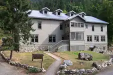 The Golden West Visitor Center was originally a lodge. Prior to the opening of what would be called the Golden West Lodge, "the Argonaut" provided the main lodging accommodations for visitors to Stehekin. The Argonaut began as a rough edifice in the early 1890s as a boarding house for miners. It eventually evolved over time into the elegant Hotel Field, owned and operated by the early entrepreneur Merritt Field. In 1926, the hotel's time came to an end when a dam was built in Chelan raising the lake to a level that would eventually flood the ground where the hotel stood. Jack Blankenship was the last manager at the Hotel Field. Foreseeing the end of the Hotel Field, Blankenship saved essential parts of the doomed hotel and brought them to higher ground across the lake, erecting a new resort, the Golden West Lodge in 1926.[2] For much of its life, the Golden West Lodge operated through difficult economic times: the Great Depression, World War II, and the beginning of the automobile tourism, not ideal for a destination like Stehekin. The Lodge passed through the hands of seven different owners until it closed in the 1970s and was repurposed as North Cascades National Park's Golden West Visitor Center.
