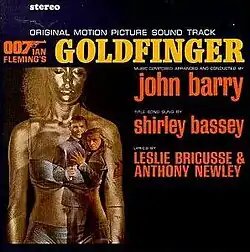 John Barry had composed the previous James Bond soundtrack for From Russia with Love. Due to Barry's increased "compositional depth" as seen through the soundtracks he produced since From Russia with Love, movie producers Albert Broccoli and Harry Saltzman allowed him to write the theme song for Goldfinger in addition to the soundtrack.[1] Barry created the melody of the song before drafting the lyrics with the help of Anthony Newley and Leslie Bricusse.[2] The theme was first sung by Newley at a demo session on 14 May 1964. At the behest of Barry, Shirley Bassey was chosen to sing the track. On Bassey, Barry was quoted saying "Nobody could have sung it like her; she had that great dramatic sense." The theme was recorded on 20 August 1964 after an all-night session in the recording studio.[3] The session was produced by EMI in-house producer George Martin, who also was the Beatles' producer at the time. Guitarist Vic Flick, who played on the track, recalled at a 2012 Academy of Motion Pictures Arts and Sciences salute to the music of James Bond that Bassey was having difficulty getting a proper take. Martin spoke to her and then over the recording baffle her brassiere came flying. She nailed it on the next take.