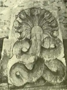 Goli was the site of archaeological excavation in 1926 by Gabriel Joveau-Dubreuil. The remains of a stupa were found, clad in Palnadu limestone panels.[4] Scenes from the Jataka tales and the Buddha's life are prominent themes. The archeological evidence of a Vihāra consisted of two carved pillars and a votive stupa, which may have been part of a monastic establishment.[3] A solitary seven-hooded Mucalinda panel has been enshrined in situ in the village as Nagamayyā.[4] It is non-figural, i.e. Buddha is represented as a stupa, not an image.