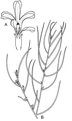 Goodenia disperma is an erect undershrub with few branches and that typically grows to a height of 30 cm (12 in). The leaves are linear and arranged on the stem, 3–50 mm (0.12–1.97 in) long and 1.5–2 mm (0.059–0.079 in) wide. The flowers are arranged in racemes up to 150 mm (5.9 in) long with leaf-like bracts at the base, each flower on a pedicel 1–2 mm (0.039–0.079 in) long. The sepals are linear to lance-shaped with the narrower end towards the base, 4–5 mm (0.16–0.20 in) long and the corolla is white and about 9 mm (0.35 in) long. The lower lobes of the corolla are 3–5 mm (0.12–0.20 in) long with wings about 0.5 mm (0.020 in) wide. Flowering occurs from November to May and the fruit is an oval capsule about 8 mm (0.31 in) long.[2]