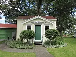 Gordon had her own library and school, with the teacher serving as the librarian. In 1950, with easier access to motor transport, the library was demolished with the books being given to local residents.[2]: 275 Gordon Public School was originally called Armadale School for the planned Armadale Township. The township was never established and in 1896 it was renamed Gordon School. The building was in use until 1938 when a new school for Gordon was erected. The Gordon School Building fell into desuetude until being moved onto Selwyn School, near Te Poi, in 1946. 17 years later Selwyn School merged into Te Poi School and the building was sold to a farm and used to store hay. In 1983 it was moved onto the Firth Tower Museum in Matamata. The building is registered as category 2 with Heritage New Zealand.[3][2]: 298
