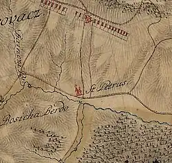 The place has seen a lot of military activity, some of which was described in military reports of Austro-Hungarian military. One such description from 1789 tells about a group of 31 men surrounded in one Chardak by the Turks. When surrender was refused, the Turks tried to burn Chardak with a wagon filled with straw, pushed by eight men. Chardak snipers however managed to shoot down all eight of them. Turks then tried to let wagon roll downhill, but the burning wagon got stuck in bushes and they gave up, but did took time to burn and pillage village. It is unclear which of CP was in question, but the story is that it was not "the first hill" but, "in a valley (..) was a wooden chardak, neither disguised nor entrenched".[4]