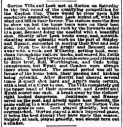 The club's biggest FA Cup win; 6–1 over Leek in the 1891–92 1st qualifying round, Athletic News, 5 October 1891