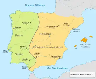 The Suebi arrived in 409 in Spain where they have since stayed in the poor and mountainous Gallaecia. Initially, they were not a threat to the Romans. Compared to the Visigoths and Vandals, they only brought small war gangs on their feet. In contrast, they were never part of the Roman covenant policy, so that they behaved differently from the foederati in Gaul who served as garrison soldiers and were under the supervision of the Roman army .[3] Emperor Honorius did not think it was necessary at the time that the military campaign of Wallia from 415 to 418 was also directed against the Seubi. Nevertheless, there was a lack of a strong imperial army in northwestern Spain to offer sufficient counterweight, usually the inhabitants had to defend themselves.[4]
