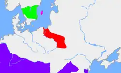 The red area is the extent of the Wielbark Culture in the first half of the 3rd century. The dark pink area is Gotland and the green area is the traditional extent of Götaland
