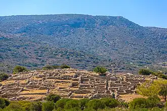 Harriet Boyd-Hawes first excavated the Minoan village for three field seasons in 1901, 1903 and 1904. Boyd and her team were able to expose nearly the entire town, uncovering sixty houses, the cemetery, a road system connecting everything and a central building which she called "the palace".[4] Similar "palatial" complexes have been found throughout Crete and while recent scholarship have contested this original interpretation, the term 'palatial complex' remains the scholarly term for them despite being a misnomer.[4] They also excavated at the site of Vasiliki which lies one mile further in on the isthmus.[5] In 1971, 1972, and 1976 Jeffrey Soles and Costis Davaras conducted supplementary modest excavations at the site.[6][7] In 1973 a lost notebook of Hawes was recovered which contained detailed descriptions and findspots of the recoveries.[8] From 1992 until 1994 Vance Watrous conducted a survey of the site and its surrounding area.[9] After cleaning seasons in 2008 and 2009, from 2010 until 2014 Vance Watrous excavated at the site.[1][10]
