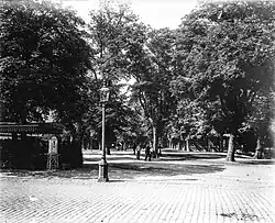 The triangular area between Esplanaden, Store Kongensgade (Nyboder) and Kastellet was from 1782 home to a ropewalk. It was later converted into a Guard Hussars barracks.[1] At the turn of the 20th century, it was decided to demolish the outdated installation to make way for high-end apartment buildings. A competition was held and a plan for redevelopment of the area was adopted by the city on 29 June 1903. Demolition of the barracks buildings began on 1 November 1905 and the area was sold to private investors shortly thereafter.[2] A broad boulevard inspired by those of Haussmann in Paris replaced the outer moat of Kastellet and the smaller streets in the area were all named after localities associated with the island of Bornholm. The plan required all apartments facing Grønningen to have between six and 12 rooms while the rest of the apartments should have at least five rooms.