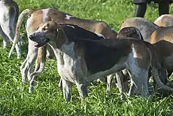 The Grand Anglo-Francais Tricolore is a breed of dog used in hunting as a scenthound, usually in packs. It is one of the Anglo-French hound breeds which were created by crossing French scenthounds with English (Anglo) Foxhounds.