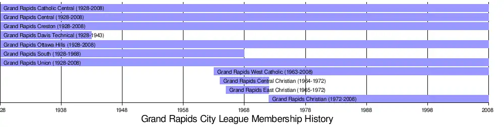 The Grand Rapids City League's last competitions were held in the 2007-2008 school year. The league's member schools joined the Ottawa-Kent Conference[1] prior to the 2008-2009 school year.