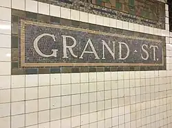 This underground station has two side platforms with two tracks.[25] Fixed platform barriers, which are intended to prevent commuters falling to the tracks, are positioned near the platform edges.[26][27] The mosaic band on both platforms features greys along with aqua, orange, ochre, light blue, and light green. Near the south end of the station, there are gratings near the ceiling, with the tile band cut out to fit around them. A historically correct section of replacement tile can also be seen in this area. The name tablets read "GRAND ST." in serif font on a brown background, yellow inner border, and green outer border. There are no columns on the platforms since they are on a curve except for some blue i-beam ones at the center where fare control is.