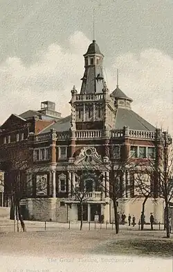 The Grand Theatre stood on the corner of Windsor Terrace and Civic Centre Road. It was constructed in 1898 but included some 18th-century buildings on its east side. It was designed by the architects William Hope and J. C. Maxwell of Newcastle upon Tyne and was built by Messrs Jenkins & Sons of Southampton in red brick with terracotta dressings in a French Renaissance style. The front entrance was enhanced with a balustrade above and a central tower, at the top of which was a high domed lantern fitted with a purple light.[2]