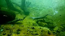 Two river otters seen swimming underwater in the wildlife exhibit at Grandfather Mountain State Park, North Carolina
