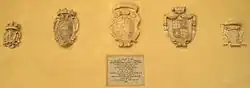 Some escutcheons containing the coats of arms of Grand Masters of the Order are found affixed to the wall of one of the corridors of Neptune's Courtyard. These formerly adorned some of the Order's buildings, but they were removed in the 19th century. They were retrieved by Governor Sir Arthur Lyon Fremantle in 1897, and were affixed to the courtyard "for their better preservation", as indicated by a marble slab below the coats of arms.[28]