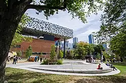 On July 10, 2017, after a cost of $15 million and construction lasting 15 months, a renovated Grange Park officially reopened with many improvements such as expansion of the children's play area, 80 new trees, expanded lawn area, an off-leash dog area, new public washrooms, new water features, and new seating areas. As part of the renovation, the Henry Moore sculpture Large Two Formspark was moved from the corner of Dundas and McCaul Streets to become the centrepiece of the park.[4] The park was designed by PFS Studio with Thinc Design as executive architects.[3] The AGO, the City of Toronto, the Weston Family, and various community groups jointly fininanced the renovation. There is also an endowment fund to support the park's long-term maintenance.[3]
