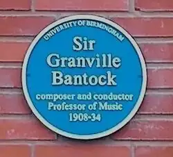 Early conducting engagements took him around the world with a musical comedy troupe. With his brother Leedham Bantock he wrote a couple of music hall songs which met with some success.[6] He founded a music magazine, The New Quarterly Music Review,[2] but this lasted only a few years. In 1897, he became conductor at the New Brighton Tower concerts,[2] where he promoted the works of Joseph Holbrooke, Frederic Hymen Cowen, Charles Steggall, Edward German, Hubert Parry, Charles Villiers Stanford, Corder and others, frequently devoting whole concerts to a single composer. He was also conductor of the Liverpool Orchestral Society with which he premiered Delius's Brigg Fair on 18 January 1908. He became the principal of the Birmingham and Midland Institute school of music in 1900.[2] He was a close friend of fellow composer Havergal Brian. He was Peyton Professor of Music at the University of Birmingham from 1908 to 1934 (in which post he succeeded Sir Edward Elgar).[2][7] In 1934, he was elected Chairman of the Corporation of Trinity College of Music in London. He was knighted in 1930.[2] His students included Anthony Bernard, Lilian Elkington, Eric Fogg and Dorothy Howell.