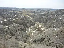 The East Block of the park is located about an hour's drive south of Assiniboia on the south side of the Wood Mountain Hills in Census Division No. 3. The interpretive centre is in the McGowan House at the new Rock Creek Campground and the information centre is at the museum in Wood Mountain Regional Park.[12] The East Block is more of a wilderness area but has views of the badlands of Rock Creek, the Cretaceous–Paleogene boundary, and prairie skies. A one-lane, 11-kilometre (6.8 mi) parkway traverses the Rock Creek Badlands.[13] The East Block contains the Grasslands National Park (east) (SK 023) Important Bird Area.[14]