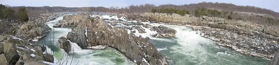 Great Falls lies in the Piedmont upland on the right bank of the Potomac River.[9][10] The Potomac River forms the northern and eastern borders of the CDP, and several of its tributaries flow north and east through the CDP. From north to south, these include Nichols Run, Clarks Branch, and Difficult Run. Difficult Run (along with Leesburg Pike) forms the southern border of the CDP. Two of its tributaries, Captain Hickory Run and Piney Run, flow southeast through the southern part of the CDP.[8][10] The Great Falls of the Potomac River, the community's namesake, are on the east side of the CDP.[10]