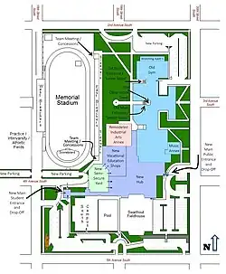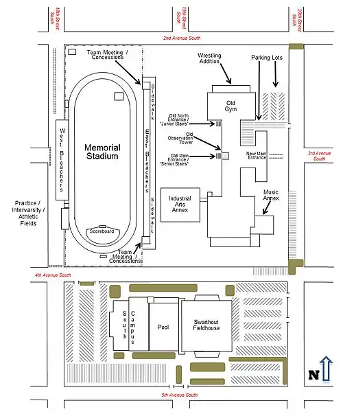 The main campus is bounded by 2nd Avenue South on the north, 20th Street South on the east, 4th Avenue South on the south, and 18th Street South on the west. Memorial Stadium backs directly against 18th Street, which has been blocked off to vehicular traffic since at least the mid-1970s. 20th Street South was blocked off between 4th and 2nd Streets South in 1978, and now is used as a maintenance vehicle access road for the high school. 4th Avenue South between 18th and 20th Streets South was blocked off at the same time, although the eastern and western portions of the street provide non-through traffic access to the parking lots on the east and west sides of the fieldhouse.
