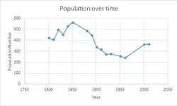Through comparing census data of both 2001 and 2011 we can see that in 2011 there were fewer young people but more old people. This is seen as in 2011 there were 101 people over 60 while 2001 had 73. In 2001 117 people were 29 and below while 2011 had only 106 people.[14] Therefore, the mean age is different because in 2011 its 42.7 while 2001 was 37.57[15] This also gives further evidence to the current ageing population of the country