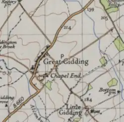 - "GIDDING (Great), a parish in the district of Oundle and county of Huntingdon; on Alconbury brook, adjacent to Northamptonshire, 6 miles SW by S of Stilton, and 6½ SW of Holme r. station. Post town, Hamerton, under St."[2]