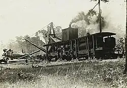 The lumber company complex included 50 miles (80 km) of train track, lumber drying yards, and a planing mill.[7] Before being transported to the drying yards, lumber passed through a dipping station that contained an alkali solution to prevent fungal staining. Carrying capacity of the drying yards was about 45,000,000 board feet (110,000 m3).[7] Waste material was either converted into boxes, staves, shingles, and lathes or transported to a boiler room for generating steam and electric power to run the mill.
