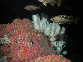 Yellowtail rockfish over boot sponges in the Greater Farallones National Marine Sacntuary.