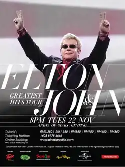 The Greatest Hits Tour[1] was a concert tour by Elton John. The tour started in February 2011 in Victoria, British Columbia, Canada[2] and has visited the Americas, Europe, Asia and Australasia. The tour placed ninth on Pollstar's "Top 50 Worldwide Tours (Mid-Year)", earning over $40 million with 57 shows.[3]