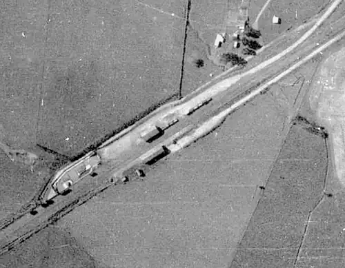 On 11 June 1939 the station was moved about 440 yd (400 m) north-westwards,[12][13] from its original site to the east of Cliff Road.[14] The move, which had been planned in 1915,[15] was associated with work starting in 1935,[16] and for which £4,989[17] was funded in 1938,[18] to ease the gradient and curve on the bank between Greatford and Kakariki[12] to 1 in 70.[19] The realigned curve opened in March 1939 and eliminated two level crossings.[20]