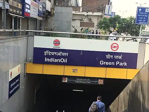 The Green Park metro station is located on the Yellow Line of the Delhi Metro below Aurobindo Marg.[2]