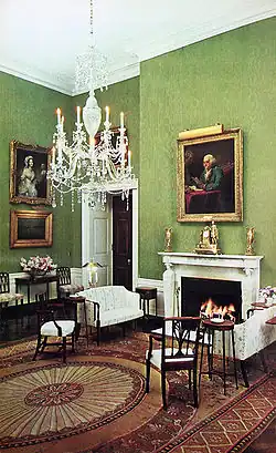 Over the next 37 years, subsequent presidents mostly maintained the Green Room as Coolidge left it, with only minor alterations.[6] One significant change was made after the White House was gutted and renovated under President Harry S. Truman in 1952. When the Green Room was decorated after the renovation, the walls were covered in a green silk damask in the style of Robert Adam (manufactured by American fabrics firm Scalamandré). The window treatments and drapes used the same fabric, with the window treatments covering the window moldings.[7]