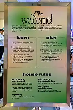 Green Tile Social Club (GTSC) is a New York City-based social club to teach and play mahjong. The mission of the club is to "connect with and give back to the Asian American community".[1] The social club has also become a replacement or supplemental to traditional nightlife, which has attracted many Gen Zers due to their shifting priorities and social habits. The club plays the Hong Kong style of mahjong.[2]