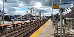 The station has two high-level side platforms. The north platform, next to the main track, is 12 cars long. The south platform, next to the siding, is eight cars long, and is not in regular use.[7] There is also a pedestrian bridge connecting the two platforms.[7] On either ends of the station, the two tracks merge into one.