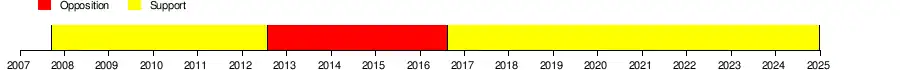 In early 2014 the Zeleni had signed political cooperation with the New Democratic Party, a political fraction of the Democratic Party led by its former leader and the nation's president Boris Tadić. Originally agreeing to form a political cooperation and jointly go at the forthcoming 2014 elections, by mid-February 2014 the NDS had collectively joined the Greens, who chose a new Statute, program and Tadić as their party leader, officially preregistering under the name New Democratic Party–Greens. On 14 June 2014, the New Democratic Party seceded and became independent political party, so the name of the party was changed again to "Greens of Serbia". Since 2016, it has allied itself with the Socialist Party of Serbia and United Serbia.