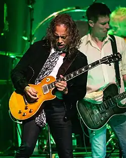 In 2010, the Gibson Custom Shop launched the Collector's Choice series, which included a limited run of replicas based on Greeny.[16] An Artist's Proof version owned by Moore was auctioned off following his death in 2011.[17] In 2013, Gibson released the Gary Moore Les Paul Standard, which included a number of features modeled after Greeny, including a 1950s neck profile, mismatched volume and tone knobs and a mahogany body topped with a figured AA-grade maple top.[18] Def Leppard guitarist Vivian Campbell owns a custom Greeny replica, nicknamed "Gary" after Moore.[19][20]