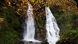 The Grey Mare's Tail (Welsh: Rhaeadr y Parc Mawr) is a waterfall on the very edge of the Snowdonia National Park near Gwydir Castle in Conwy County Borough, north Wales. It lies just off the B5106 road between the town of Llanrwst and the large village of Trefriw. The Welsh name, Rhaeadr y Parc Mawr, derives from the fact that the falls are fed by a large stream that has its source in the Gwydir Forest, and flows through the old Parc Mine, about a mile to the southeast. The name 'Grey Mare's Tail' was given to it by Lady Willoughby of Gwydir Castle, possibly "in compliment to Lord Byron and the Staubbach"[1] (Byron compared the 900 ft Staubbach Falls in Switzerland to the long white tail of the pale horse upon which death is mounted in the Book of Revelation.)[2]