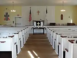 The exterior of the church building has changed little through the years, but the interior has undergone repairs and changes. At first, there was a choir loft across the front reached by stairs in the vestibule. Centered in a higher ceiling hung a bronze chandelier with five or six oil lamps and on the wall at the rear of the choir were similar side lamps. Two large wood-burning stoves heated the building. There were two single doors entering the worship room that were replaced by double doors in the center because of difficulty experienced in passing through single doors with a casket. The narrow straight-backed pews have also been replaced, although two originals pews are still kept in the vestibule. Most of these updates were done in the 1940s.[4] The present windows are original and contain handmade glass. The plank floors are original, as are the boards on the walls and the altar.