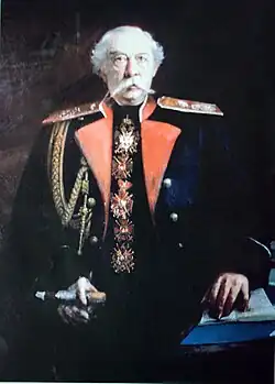 Grigol Dadiani was enlisted in the Imperial Russian Page Corps in 1828 and took part in the war against the Ottoman Empire in 1829. He then served with his father until 1834, when he was commissioned as a poruchik of the Life Guards Grenadier Regiment in St. Petersburg. In 1844, Dadiani, promoted to colonel, was enlisted in the Life Guards Preobrazhensky Regiment, but he continued his service in the Caucasus. Made major-general in 1854, he commanded the Mingrelian and Gurian militias, composed of local irregulars, against the Ottoman army in 1855 and 1856, during the Crimean War. In 1857, he was officially made a member of the His Imperial Majesty's Retinue. Dadiani commanded the 1st Brigade of the Caucasian Grenadier Division from 1858 and 1859 and took part in the storm of Gunib and capture of Imam Shamil during the Caucasian War. Dadiani was promoted to lieutenant-general in 1860 and, further following the Russo-Turkish War (1877–1878), on the occasion of the semi-centennial of his military service, to the rank of adjutant general in 1880. His final promotion, just prior to his retirement, was the rank of general of the infantry in 1883.[1]