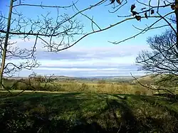 Grindon is situated near the southern end of the Peak District National Park. It is at the top of the western edge of the limestone bank of the Manifold Valley, south of Butterton and opposite Wetton on the eastern side of the valley. A comparison of two views north from the village gives some indication of the bleakness of this area in winter. The nearer village, left of centre, is Butterton, while the far skyline is of Derbyshire.