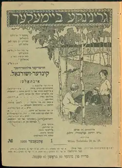 Grininke Beymelekh began publication in February 1914 by the publishing house of Boris Kletzkin in Vilna, Lithuania, and was managed by linguist Nochum Shtif and edited by poet and educator Falk Halperin. Twenty issues of the paper were produced in 1914 and 1915, until it was forced to cease publication due to the spread of the First World War. Although a children's paper entitled Farn Kleynem Oylem was included with the newspaper Di Yidishe Vokh from 1912 to 1913, Grininke Beymelekh was the first Yiddish children's magazine published as its own periodical.[1][2] The name of the periodical was taken from a 1901 poem about Jewish children ("Unter di grininke beymelekh", 'Under the Green Trees') by Hayim Nahman Bialik.[3]