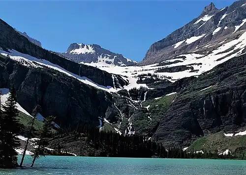 Grinnell Falls is a waterfall in Glacier National Park, Montana, US. Grinnell Falls have several major drops in its 960 feet (290 m) descent from Grinnell Glacier with the highest estimated at 280 ft (85 m). The falls are in the Many Glacier region of the park, between Mount Grinnell and Angel Wing.[2][3]