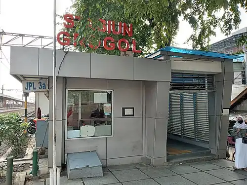 Grogol Station (GRG) (Indonesian: Stasiun Grogol) is a railway station in Jelambar, Grogol Petamburan, West Jakarta. It is the second station on the Duri-Tangerang branch line Brown Line service. The station is a strategic point for students as it is located within close proximity of Trisakti University and the University of Tarumanegara.