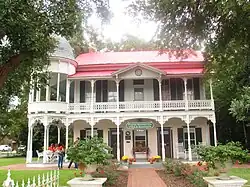 Ernst Gruene's second son, Heinrich (Henry) D. Gruene, built his own house (Gruene Family Home) and planted cotton. As cotton was a top crop it lured up to 30 families to Henry D.'s lands. In addition to his Victorian-style home (now Gruene Mansion Inn), Henry D. was responsible for several buildings in various styles, many still standing: a Victorian cottage, a large brick home, and, for his farm foreman, a frame house (now Gruene Haus).[3] In 1878, Gruene opened a mercantile store to serve the several dozen or so families sharecropping on his land. Originally known as "Goodwin", the town benefited by its location along the stagecoach route between Austin and San Antonio, the store thrived for many years and stimulated local commercial growth. A cotton gin (now Gristmill River Restaurant and Bar) powered by the Guadalupe River was added soon after.[3] Gruene Hall, which opened in 1878, is one of the oldest dance halls in Texas. The Thorn Hill School and three large cotton gins soon followed. By the time the International-Great Northern Railroad was built across Comal County in the 1880s, the small community was bustling with commercial and farming activity, and officially took the name "Gruene" after its founding father and most prominent citizen.
